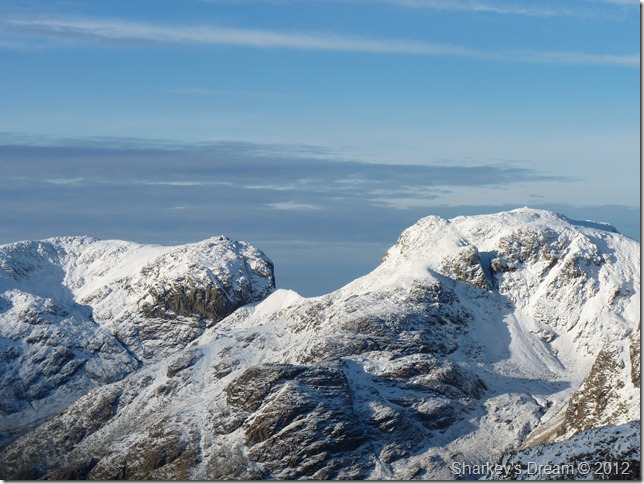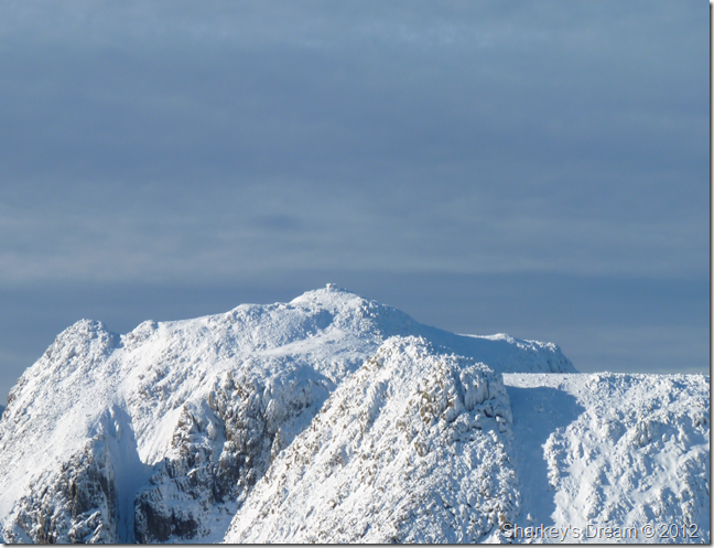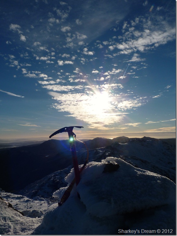 I am soon joined by the couple who headed across Climbers Traverse, we swap pleasantries mostly about the weather before I peep up, you headed across the Traverse didn’t you? I get a slight smirk from the guy, I was pretty envious of your decision I said, I was going to follow you then decided to stick to my plans, you were wise not to follow the guy tells me, the Traverse was just about cope-able but the climb along the Great Slab was a little more technical than we are used too, the woman goes onto say, we followed footprints along the whole route only to loose them at the bottom of the Great Slab, well we thought we had lost them, what we knew was the footprints turned into spikes – adding that the walker they had followed had put Crampons on at the bottom of the Great Slab, we struggled the rest of the way up, well at least your both here to enjoy the views I say, the guy clocks my Crampons tied in on my pack, he doesn’t say anything & neither do I.