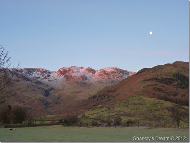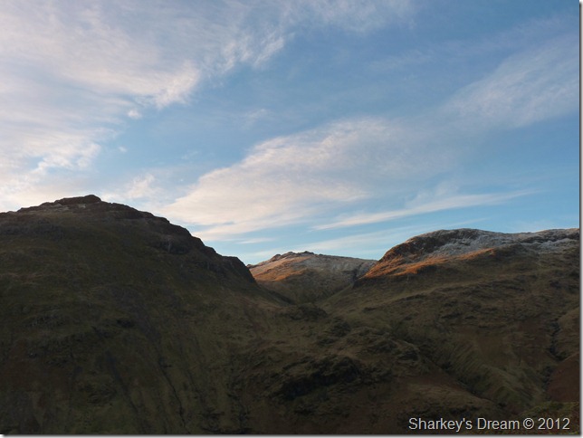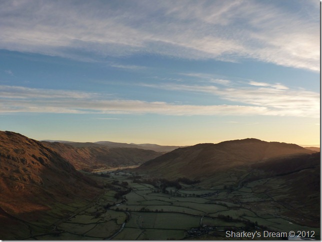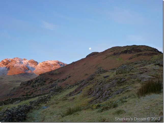 I stop a while to take in the views & to catch my breath a wee while, here looking down on a sunrise over Great Langdale & Lingmoor Fell seen over on the right of the picture.