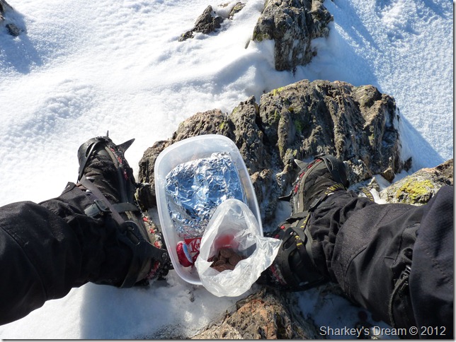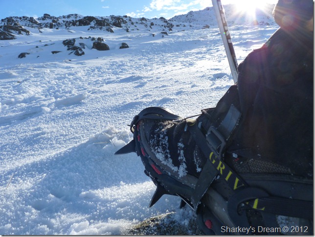It was time to add the Crampons as by now the snow is fully compact underfoot & traction was being lost footstep by footstep. |