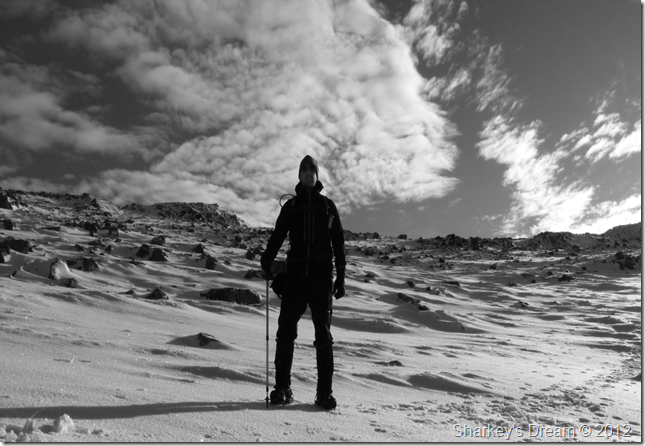 Its –4°C which feels considerably colder than -2°C Which is thee coldest I have had to deal with thus far whilst still at ground level & having just stepped out of a car with the heater set on HI. My nose drips slightly as I kneel down & lace up & adjust my gaiters.