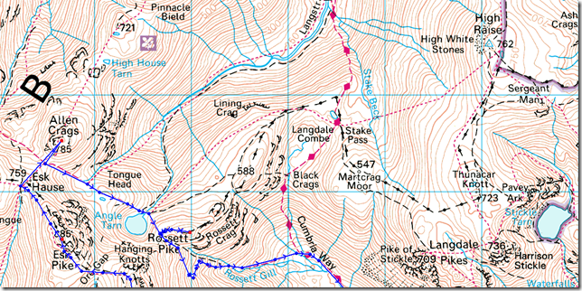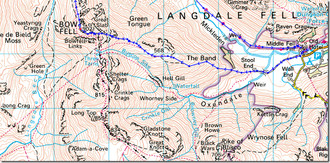 Old Dungeon Ghyll – Stool End Farm – The Band – Three Tarns – Bow Fell – Ore Gap – Esk Pike – Esk Hause – Allen Crags – Angle Tarn (Langstrath) – Rossett Pike – Cumbrian Way – Rossett Gill – Mickleden – Old Dungeon Ghyll |