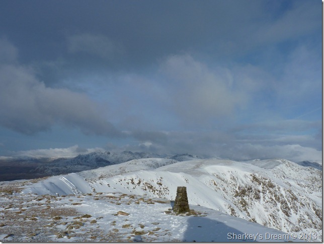 Brim Fell & a host of snow topped southern summits from Coniston Old Man trig point.