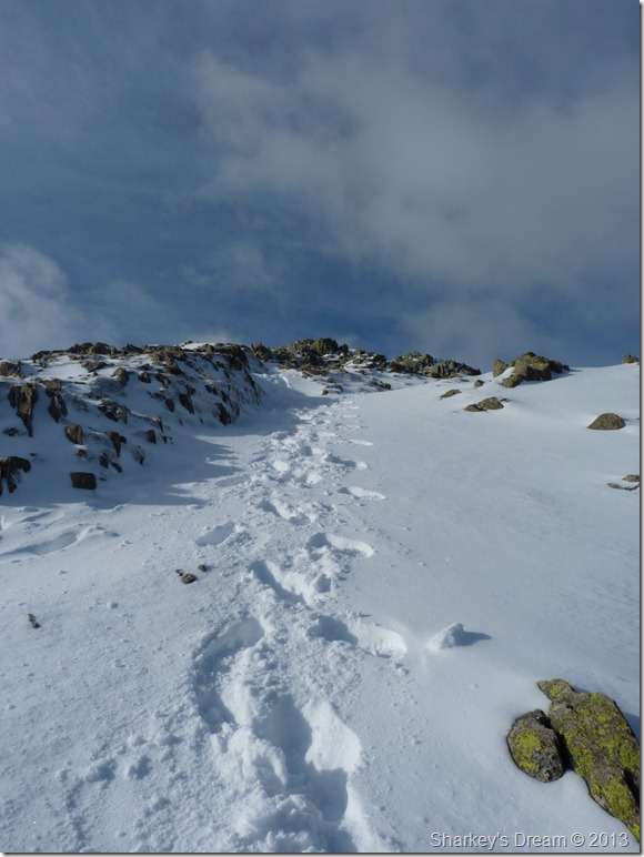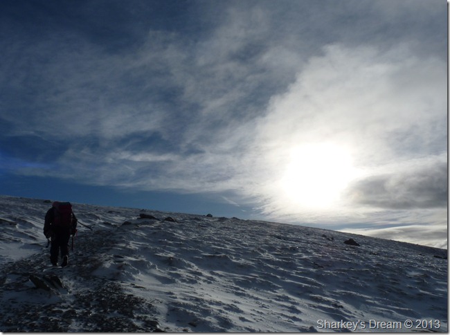 The snow was a lot less pact which meant that every footstep gave through a foot of snow, the summit doesn’t look far & indeed, it is not, but punching fresh prints into a foot deep of snow sure made for some tiring work.