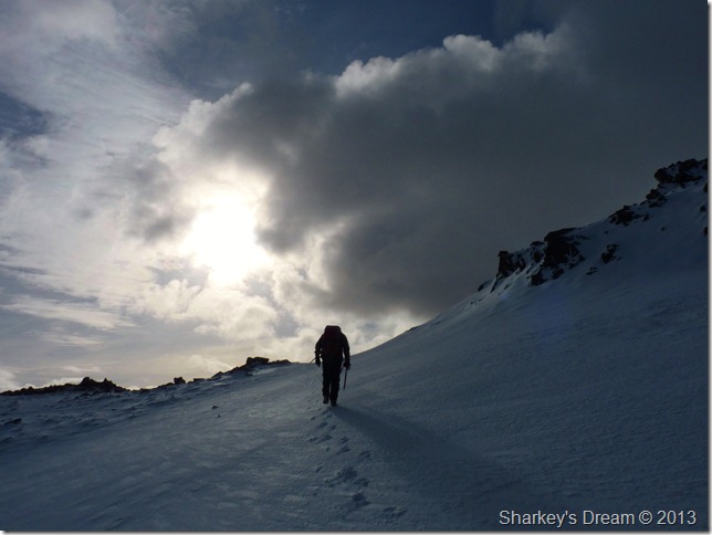 Well, in my eyes if you have to think about it for more than a few minutes you have already answered your question, don’t second guess it because its a long & tiring walk back if you have to turn around, I convince at least one of the women but the other is not as convinced, she looks at me as if I am querying her decision making, put it this way I smile, we are fully equipped for winter climbing today & given the decision I would have to think twice (not really true) to descend that way I guess – but given that these two ladies are of an elderly age(ish) & ill-equipped, I left the choice to them.