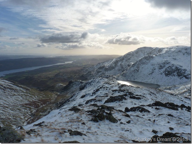 Levers Water taken from Levers Hawse, our descent route of Black Sails south ridge is in the foreground with the Lad Stones ridge directly behind. |