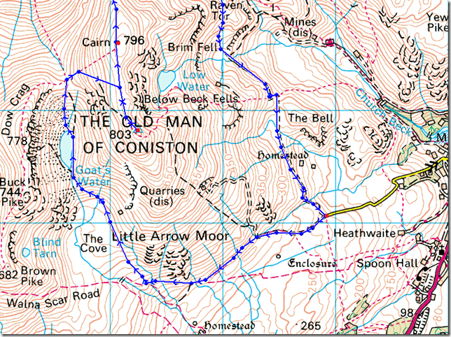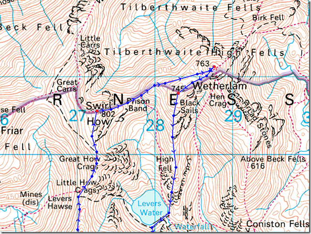 Walna Scar – Boo Tarn – Goats Water – Goats Hawes – Coniston Old Man – Brim Fell – Levers Hawse – Swirl Band – Swirl How – Prison Band – Swirl Hawse – Wetherlam – Black Sails South Ridge – Levers Water – Boulder Valley – Walna Scar |