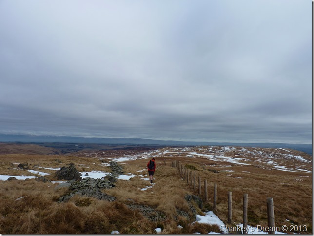 We take in our next descent via the virtually buried stone wall keeping to the right, here we make no issue to avoid the snow as we glaze over its hard crust with trusted footprints all the way to the bottom, a much favoured part of the walk.