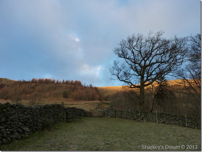 The path here passes through the gate ahead then it’s up to the walker if he/she chooses to take the path to the right or left of the single stone wall, we took the left path before passing over a sty & crossing a narrow beck.