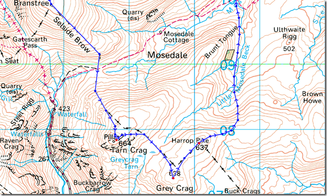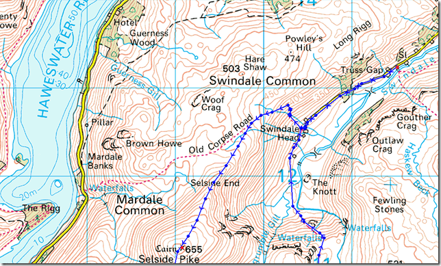 Truss Gap – Old Corpse Road – Selside End – Selside Pike – Artle Crag – Branstree – Selside Brow – Tarn Crag (Longsleddale) – Greycrag Tarn – Grey Crag – Harrop Pike – Mosedale Beck – Nabs Moor – Swindale Head – Truss Gap |