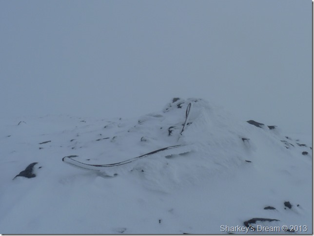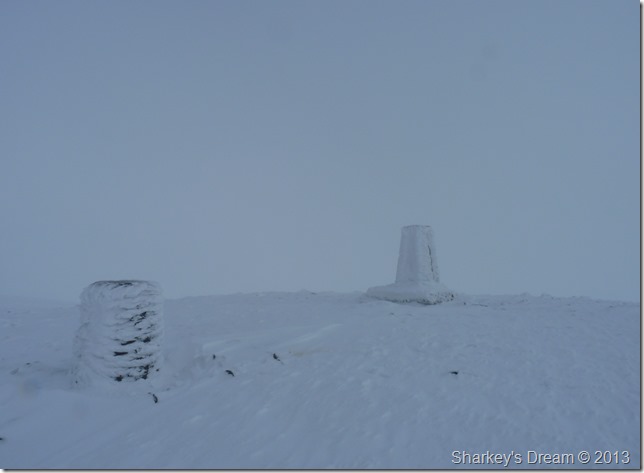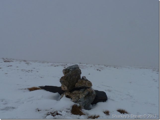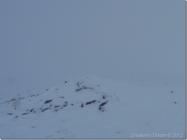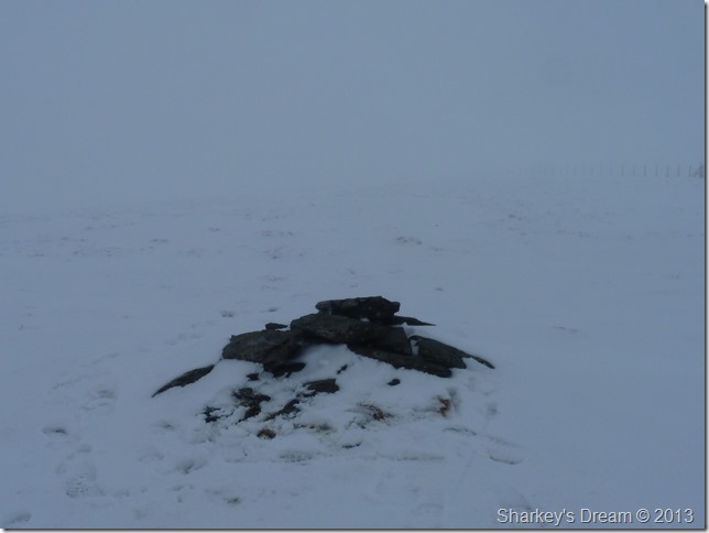 With the whiteout lifting ever so slightly I press on in good spirit towards the summit shoulder & Skiddaw’s south summit cairn. |