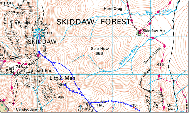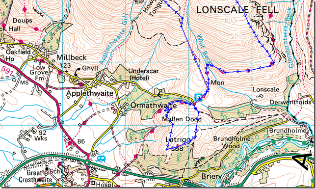 Gale Road End – Hawell Monument – Skiddaw Lesser Man – Skiddaw – Jenkin Hill – Lonscale Fell – Lonscale Fell South Ridge – Above Lonscale – Whit Beck – Hawell Monument – Latrigg – Gale Road End |