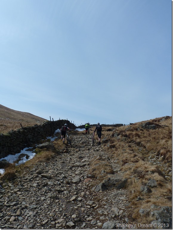 Scores of Mountain Bikes head up the Garburn Pass, a roofless ascent under difficult pitch for the walker never mind the mountain bikes, this being the reason that after every few yards, I start to find bike parts scattered along the pass as I take in the rocky descent. |