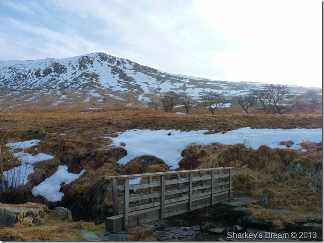 Crossing Ullstone Gill via this narrow footbridge with Kentmere Pike providing the backdrop.