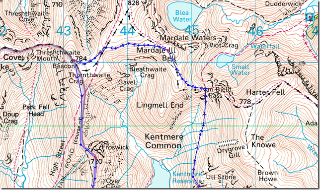 Kentmere – Overend – Nan Bield Pass – Mardale lll Bell – Thornthwaite Crag – Froswick – lll Bell – Yoke – Garburn Pass – Kentmere |