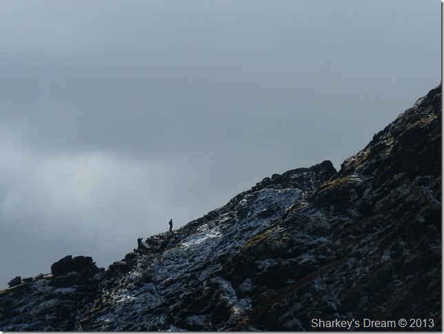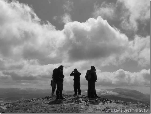 After I took this photo we made our way to the north cairn when before the slight descent I decided to tie in my walking pole whilst crouched on the ground, here the lads walked pass me while I lock eyes momentarily.