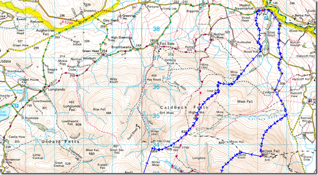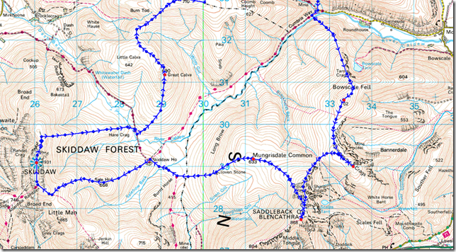 Hesket Newmarket – Carrock Beck Ford – Carrock Fell – Mosedale – Bowscale Fell – Bannerdale Crags – Foul Crags – Blencathra – Mungrisdale Common – The Stake – Skiddaw House – Sale How – Skiddaw – Blake Hill – Hare Crag – Dash Beck – Great Calva – Top of Hause Gill – Knott – Great Lingy Hill – Iron Crag – High Pike – Low Pike – How Beck – Wood Hall – Hesket Newmarket |