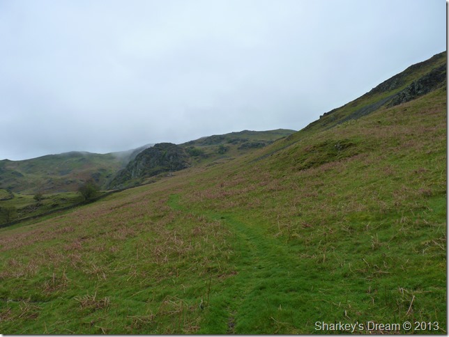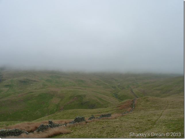 I know to wait until I come across the small cairn indicating the narrow grassy path that leads you Brock Crags bound…but the cairn is nowhere to be seen which is just as well I spotted the turn through the mist. |