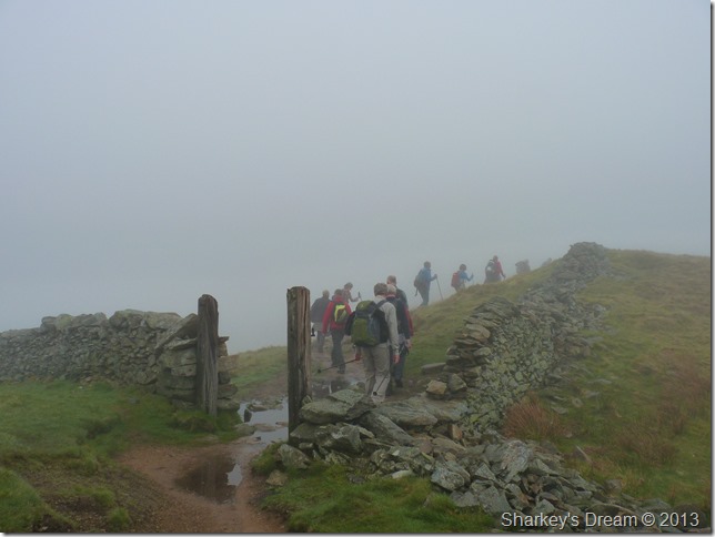 The guy is from Huddersfield & talks with a posh accent, I have to question why he is here in the first place as he is only carrying a Wainwright guide using it word for word…it says here…let me stop you there, the summit is this way I explain, you can walk with me its only a few yards (this explaining just how dense the cloud is)
