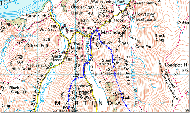 Martindale New Church – Martindale Old Church – Winter Crag – Beda Fell – Bedafell Knott – Angletarn Pikes – Brock Crags – Satura Crag – Rest Dodd – The Knott – Rampsgill Head – High Raise – Raven Howe – Red Crag – High Street Roman Road (Course Of) – Wether Hill – Brownthwaite Crag – Steel Knotts (Pikeawassa) – Birkie Knott – Lanty Tarn – Martindale New Church |