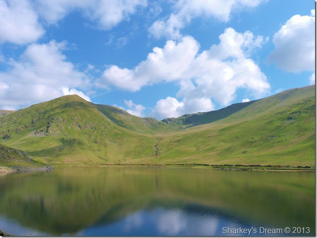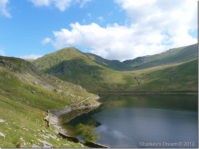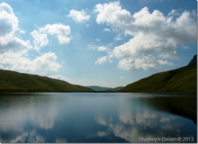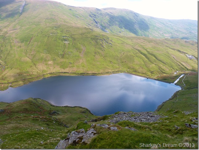 More reflections across the reservoir, this time looking directly up towards the top of Nan Bield Pass, a route I was only on seven weeks ago, back then this whole area was under a foot of snow as I had to resort to cutting steps in the snow in order to reach the top of the Pass (seen centre at the lowest point) |