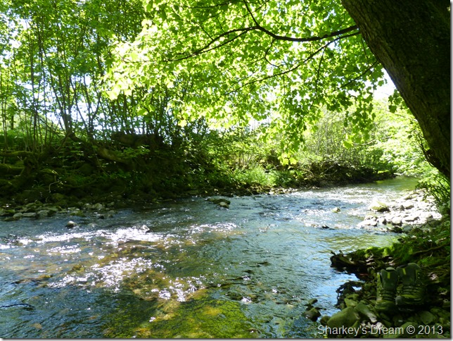My feet are a sight for sore eyes but take great comfort as the cold flowing water ease their pain. Dragon Flies dance across the water as midges swarm in their hundreds, all the while the sun breaks through glistening on top as the waters flows.