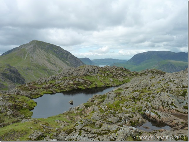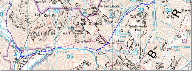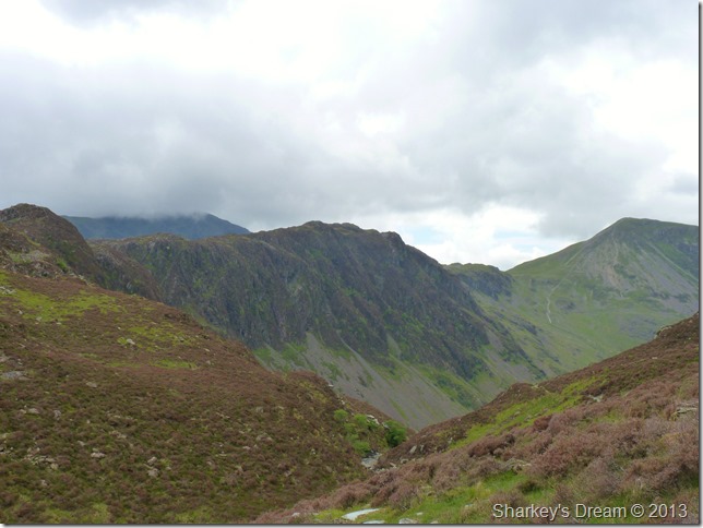 Looking back on Great Gable, Styhead & The Styhead Pass seen as a faint line flanking Great Gable lower left as we pass through Burnthwaite. |
