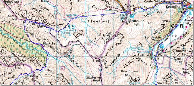 Seathwaite Bridge – Seathwaite Farm – Stockley Bridge – Styhead Gill – Styhead Tarn – Styhead Pass – Moses Trod – Wasdale Head – Black Sail Pass – Black Sail Hut – Scarth Gap Pass – Hay Stacks – Innominate Tarn – Blackbeck Tarn – Little Round How – Old Tramway Path – Honistor Hause – Honistor Pass – Seatoller |
