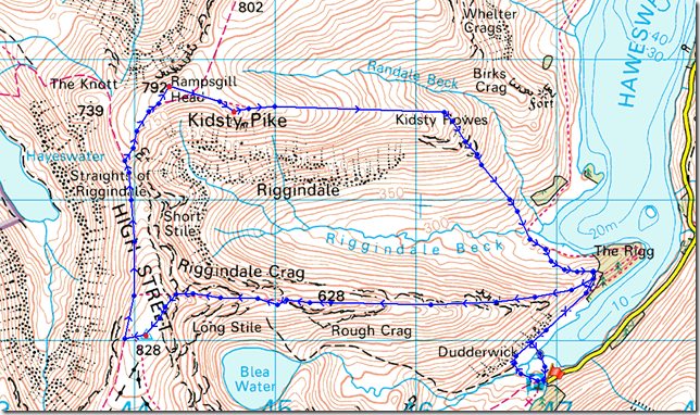 Mardale Head – The Rigg – Rough Crag – Caspelgate Tarn – Long Stile – High Street – Straights of Riggindale – Rampsgill Head – Kidsty Pike – Kidsty Howes – The Rigg – Mardale Old Road – Mardale Head |