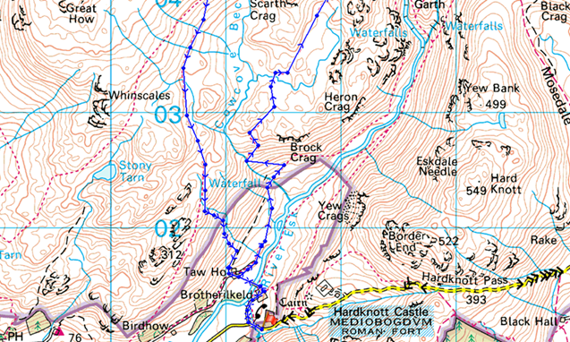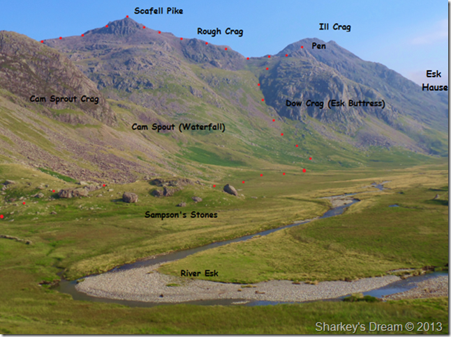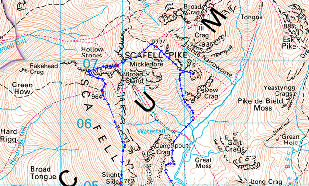 Brotherilkeld – River Esk – Taw House – Scale Bridge – Sampson’s Stones – Great Moss – Pen – Rough Crag –Scafell Pike South Ridge – Scafell Pike – Mickledore – Rakes Progress – Lord’s Rake – Scafell – Long Green – Slight Side – Catcove Beck – Taw House – River Esk – Brotherilkeld |