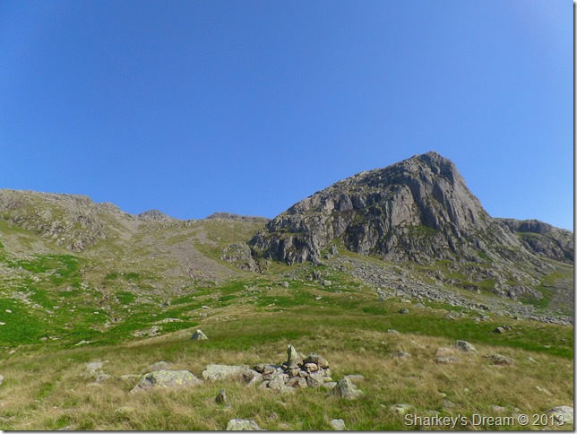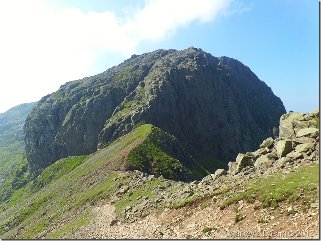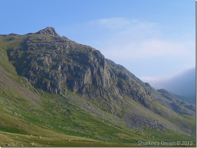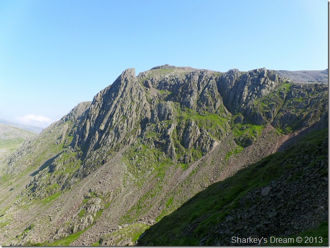 From the valley below Pen’s summit is obscured by the fast vertical crags of Esk Buttress.