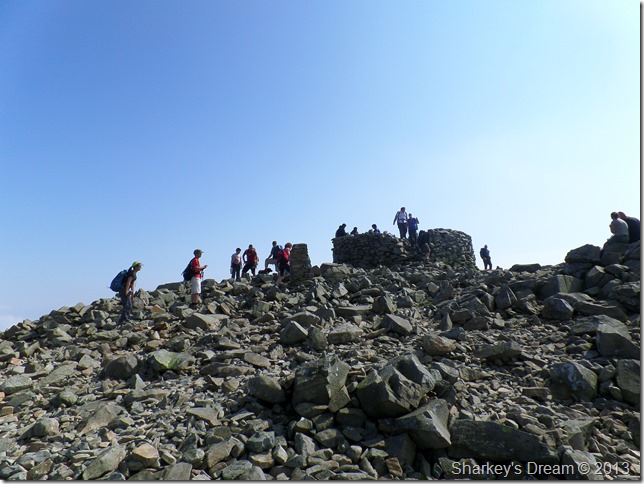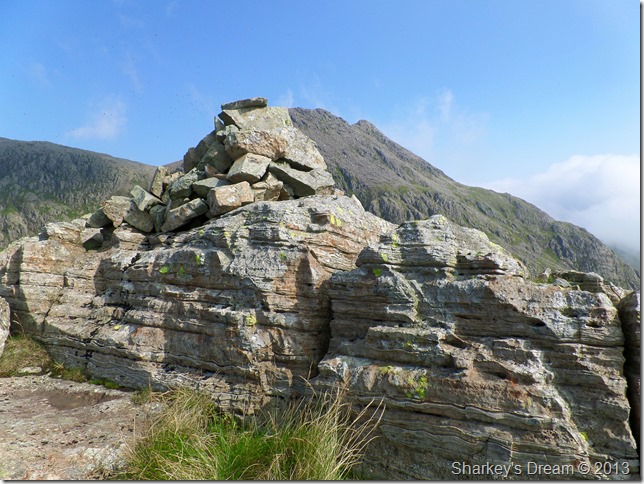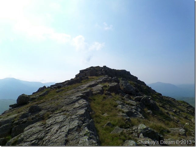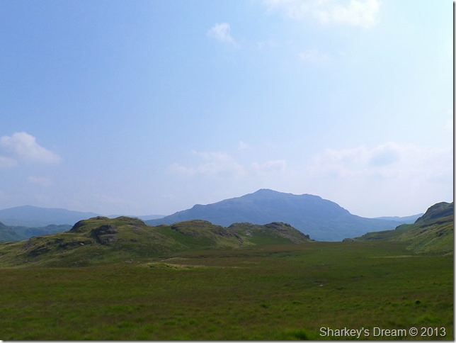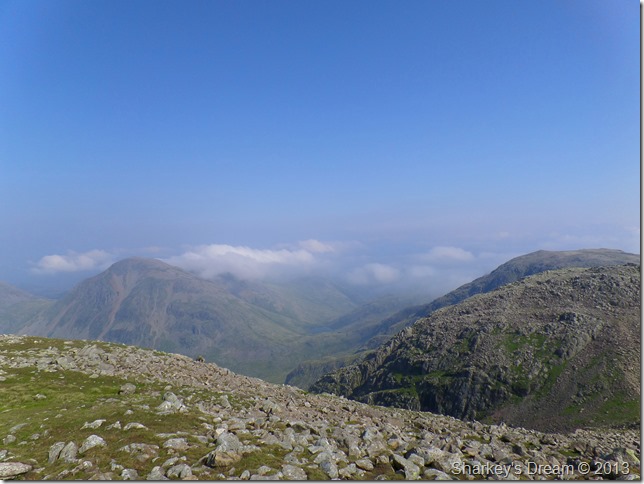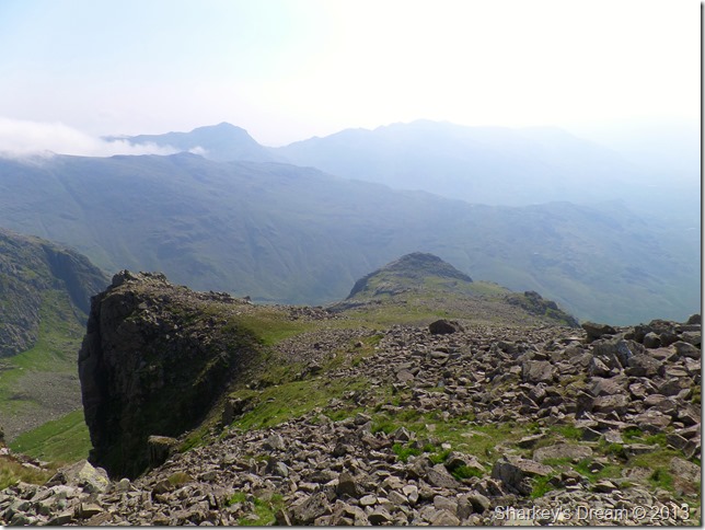 The haze continues as I took this photo looking back on Scafell Pike, Ill Crag & Esk Pike…the shaded giant bottom right is the mighty Pen. |