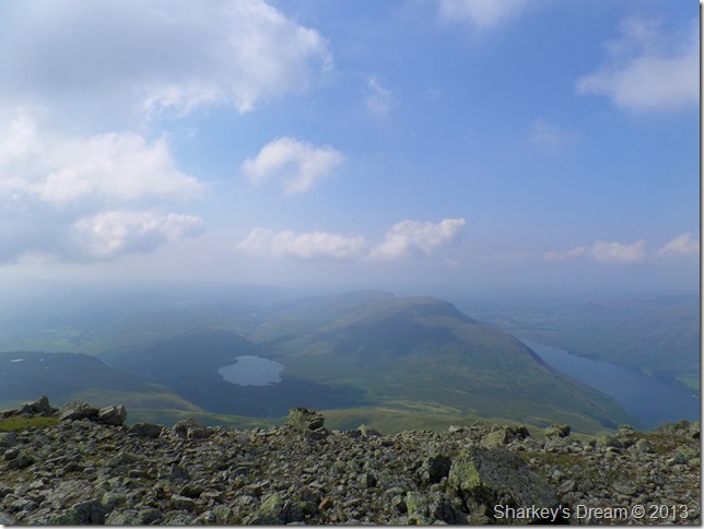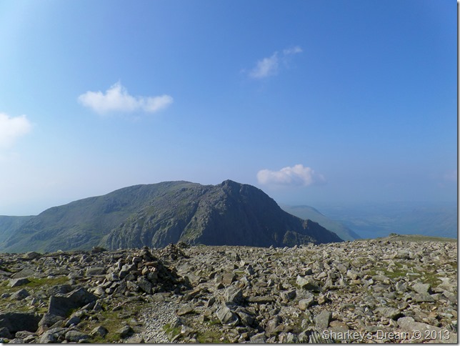 Great Gable, Styhead Tarn, Broad Crag & Great End through the haze.