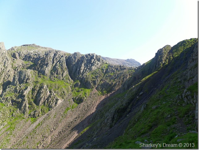 I pick up a faint path over the terrace until I reach the base of the crags, where upon – I stay with the light coloured scree (L) until venturing further right after picking up another steep grassy path.