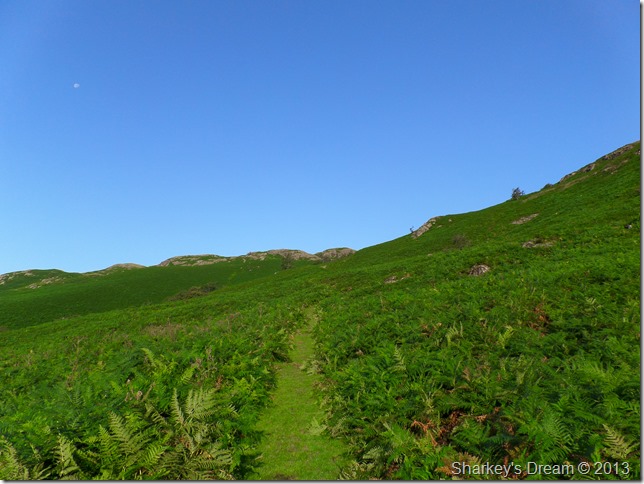 The track is very pleasant within the shade of the greenery if not a little wet underfoot, here I head for the low point just above the tree in the left of the picture where I will make my first ascent of the morning, after that, my next ascent will be ‘Pen’ which is well over three miles away. |