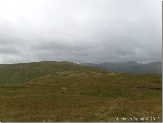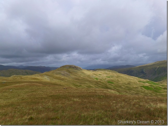A distant view towards Great End (centre) & the south western fells as we cross Puddingstone Bank to make the small ascent on Grange Fell. |