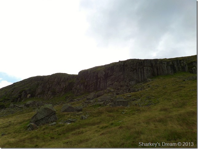 Here we head for the low point in between the Crags ahead, as you can see we are on a faint path once more which lead us to Green Combe & Dock Tarn bound. |