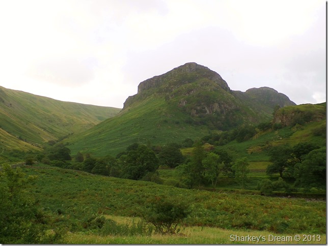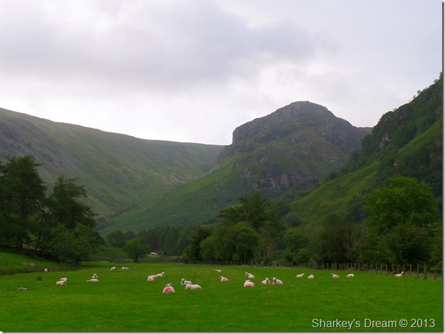 From the track I took this photo of Eagle Crag together with some very white sheep sat in a very green field.