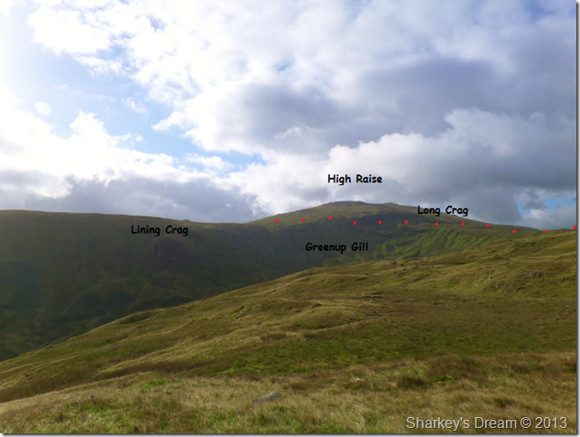 Before we headed for the summit I glanced upon our route that would see us circulate the head of Greenup Gill beneath Long Crag, sure enough we found a faint path although I wouldn’t recommend it in bad weather. |