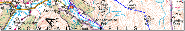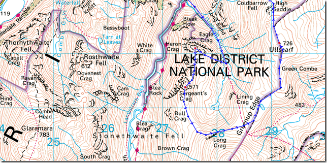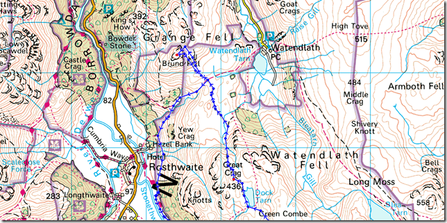 Stonethwaite – Greenup Gill – Eagle Crag – Sergeant’s Crag – Beneath Long Crag – Greenup Edge – Ullscarth – High Saddle (Coldbarrow Fell) – Low Saddle – (Coldbarrow Fell) – Lords How -Green Combe – Dock Tarn – Great Crag – Puddingstone Bank – Grange Fell – Puddingstone Bank – Cumbrian Way – Stonethwaite Bridge – Stonethwaite |