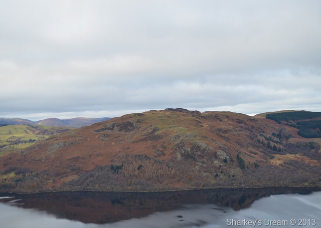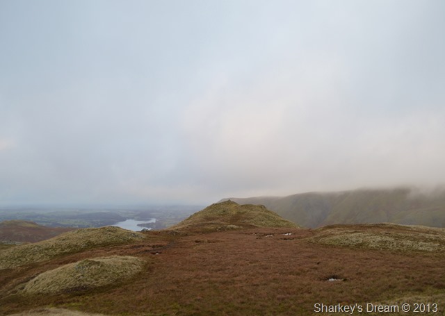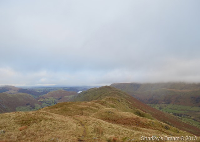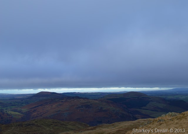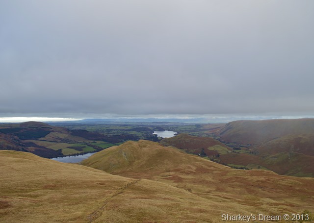Gowbarrow Fell & the Mell Fells appear in almost shadow form beneath the low cloud. |