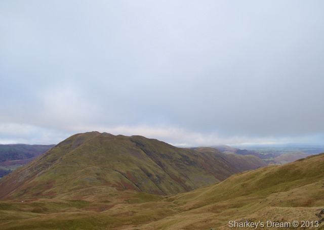 From the summit views extend towards Hartsop Above How & the valley of Deepdale. St Sunday Crag, Hart Crag & Dove Crag scatter the skyline beneath the low cloud. |