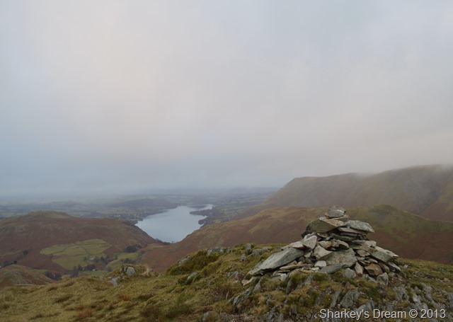 Through the mist Ullswater, Hallin Fell, Steel Knotts & Bonscale Pike appear from the Beda Fell summit cairn. |