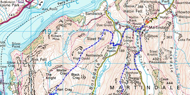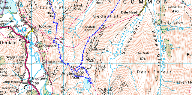 The Hause – Martindale – Nickles – Beda Fell – Bedafell Knott – Heckbeck Head – Angletarn Pikes – Angle Tarn – Boredale Hause – Steel Edge – Place Fell – Hart Crag – Low Moss – High Dodd – Sleet Fell – Garth Head Farm – The Hause |