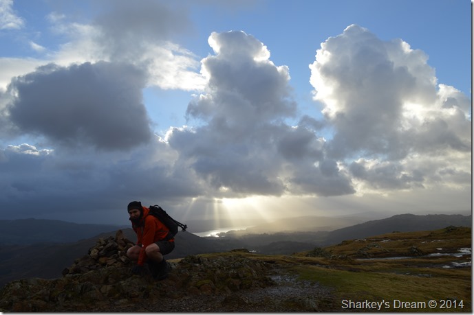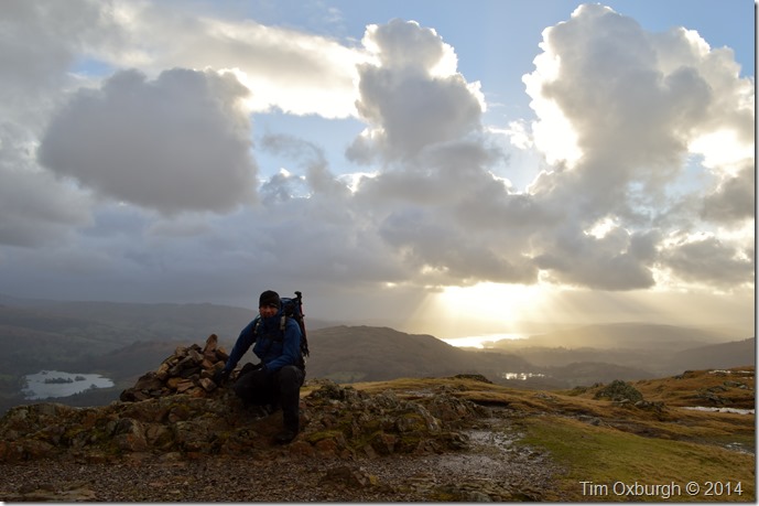 I think it was a combination of wanting to get the brilliant light in the background & the fact that standing up was quite difficult whilst at the summit with such high gusts. |