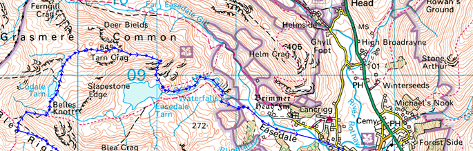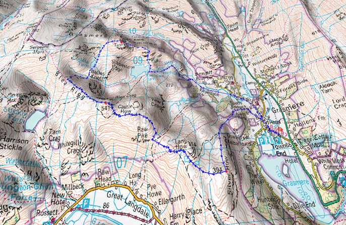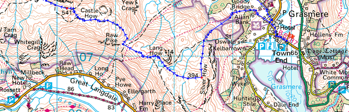 Grasmere – Allan Bank – Wray Gill – Silver How – Brigstone Moss – Langhow Tarn – Blea Rigg – Belles Knott – Codale Tarn – Tarn Crag (Easedale) – Tarn Crag East Ridge – Easedale Tarn – Sourmilk Gill – Easedale Beck – Easedale Road – Grasmere |