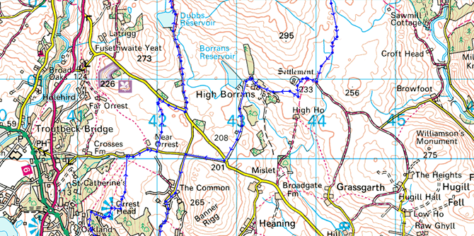 A591 – Orrest Head – Near Orrest – Dubbs Road – Dubbs Reservoir – Garburn Pass – Backstone Barrow – Sour Howes – Moor Head – Sallows – Scour Rigg – Kentmere/Ings Bridleway – Mickle Moss – High Borrans – Borrans Lane – The Common Farm – A591 |