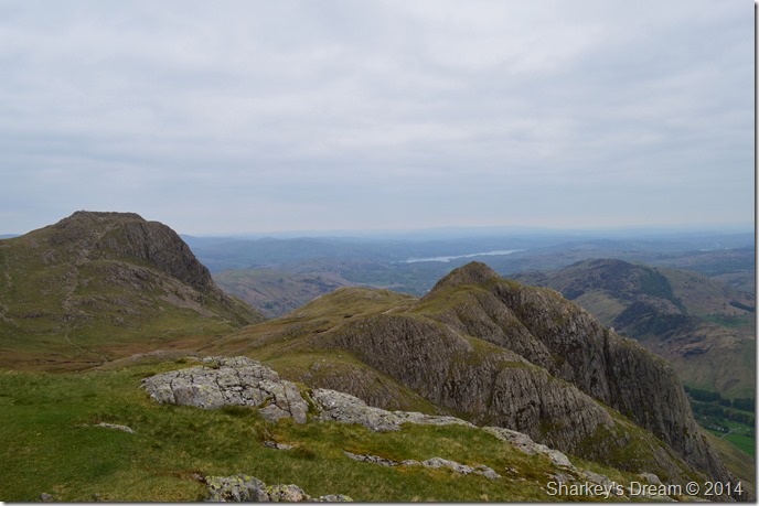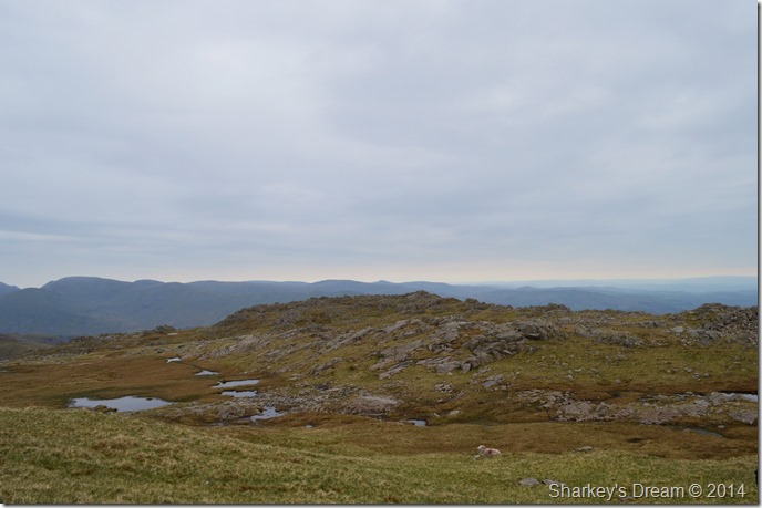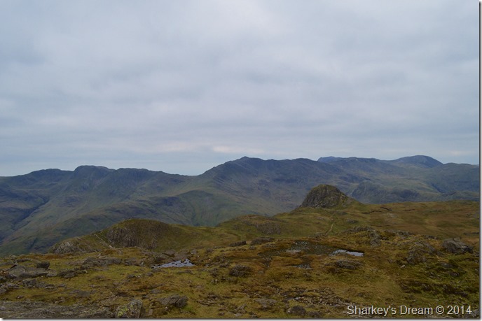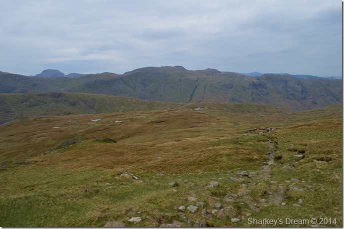 Scafell Pike is barley visible beyond a distant Ill Crag & Broad Crag. |