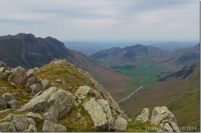 Mickleden & the Langdale Pikes from Rossett Pike summit. |