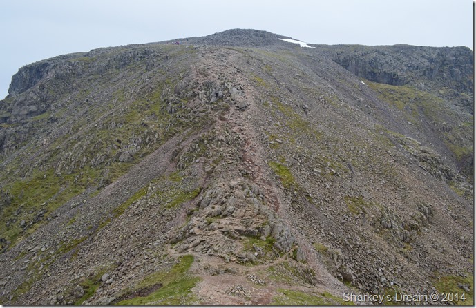 Once we had crested the ridge we stood a few moments to gather our strength back after the steep haul, with no false summits & much flatter ground underfoot we took on the slight ascent towards the summit not before I turned around to take this photo looking back along the summit ridge. |