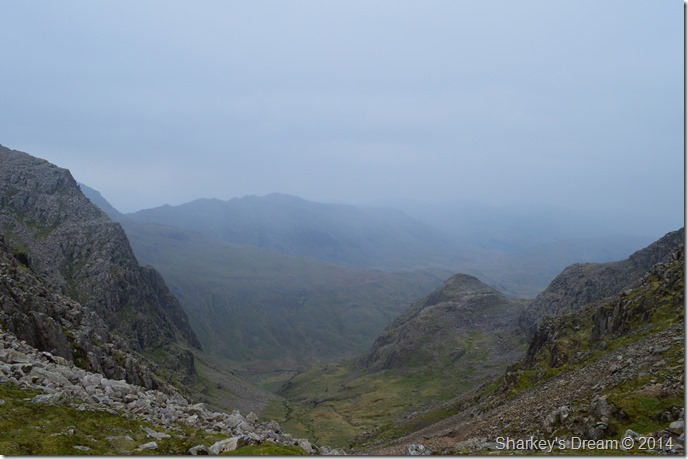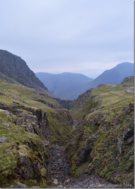 After descending to Lingmell Col we made a right turn off the path where we would pick up the Corridor Route, the air was still murky mixed with haze after the rain had passed making any long distant views difficult to make out.